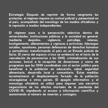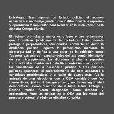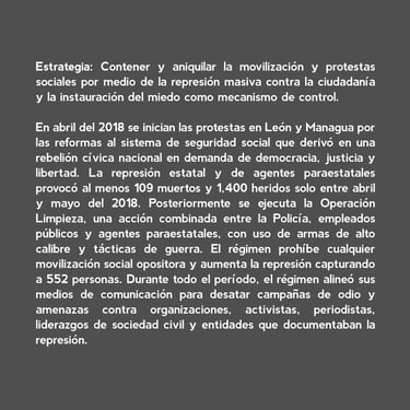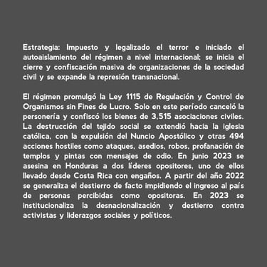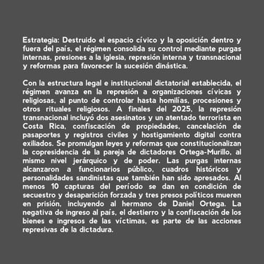 El Colectivo de Derechos Humanos Nicaragua Nunca Más ha clasificado las cinco etapas del devenir autoritario de la dictadura Ortega-Murillo entre abril del 2018 y diciembre 2025; una temporalidad usada por nuestra organización para analizar las estrategias estructurantes de la deriva represiva del régimen en su tránsito del autoritarismo a la dictadura dinástica.