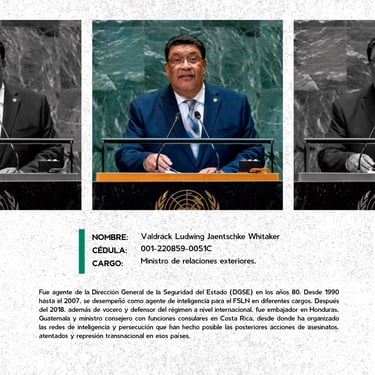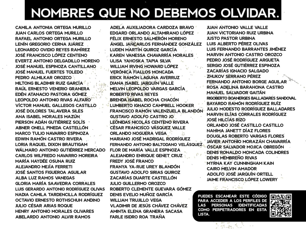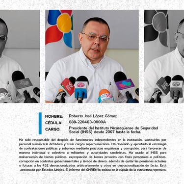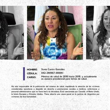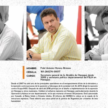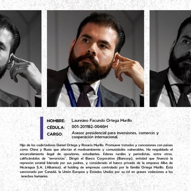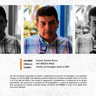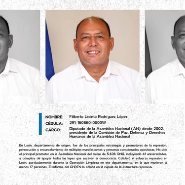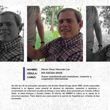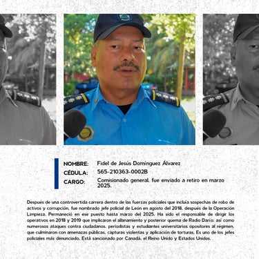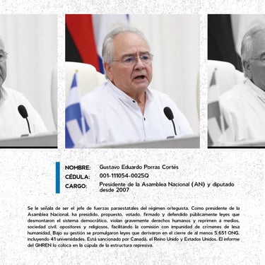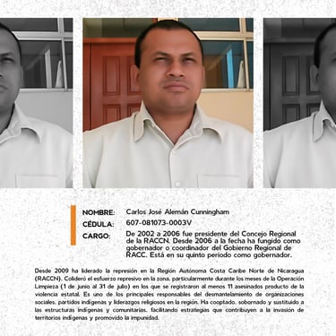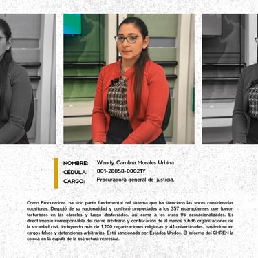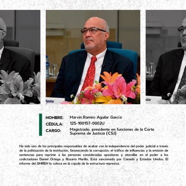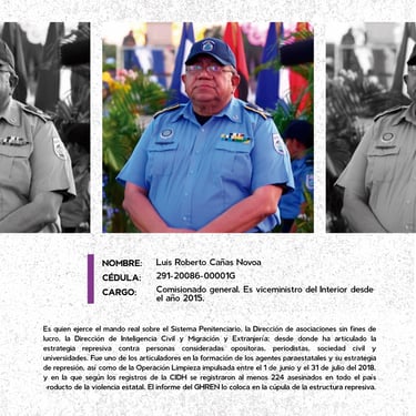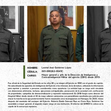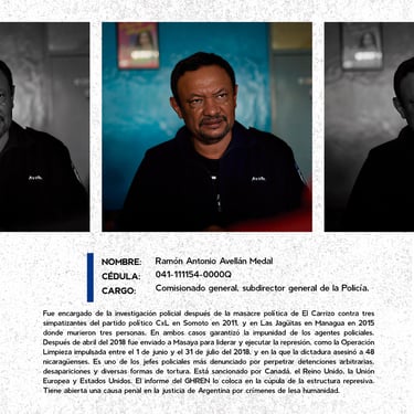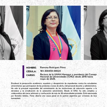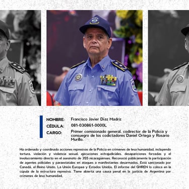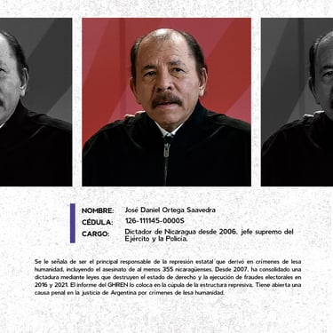 Los perfiles reúnen los nombres, cargos y funciones de los principales responsables de crímenes de lesa humanidad cometidos en Nicaragua entre 2018 y 2025, destacando las estructuras institucionales que sostuvieron la represión estatal. Muestran la coordinación de entidades como la Presidencia, la Asamblea, la Policía, el Ejército, el Ministerio del Interior, el Poder Judicial, el Sistema Penitenciario, el Consejo Nacional de Universidades y gobiernos locales, convertidos en engranajes de violencia contra la población. Se documentan delitos como ejecuciones extrajudiciales, torturas, violencia sexual, desapariciones forzadas, encarcelamientos arbitrarios, destierro, desnacionalización y confiscaciones. La identificación de estos perpetradores y su cadena de mando es crucial para la memoria colectiva, la justicia y la construcción de una democracia que reconozca a las víctimas, repare sus derechos y garantice la no repetición.